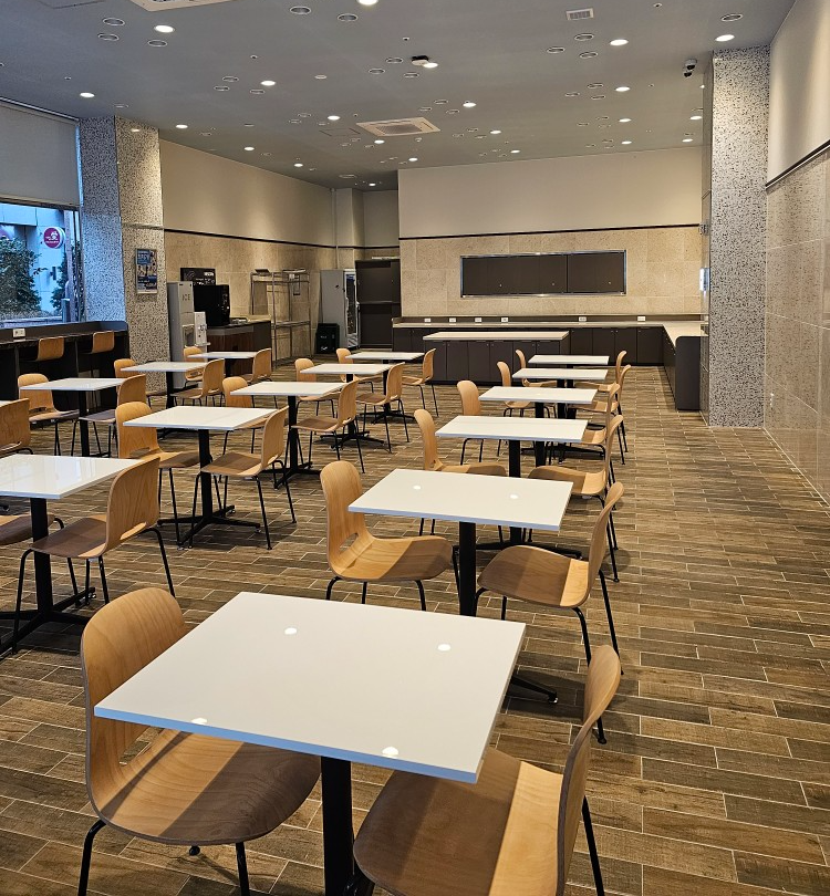 배식장소 근처엔 정수기와 커피머신이 있습니다. 얼음 제조기가 같이 있는 건 의외네요. 시원한 물 위주로 드시는 분에게 유용하겠습니다. 저는 커피를 좋아해서 식후땡으로 한 잔 마시러 갔었는데요, 저보다 먼저 커피 받으신 아저씨가 마시자마자 저를 의식하듯 이거 맛없다고 하시며 버리셨습니다. 그리 맛이 없었나.. 하고 저도 한 잔 받았습니다. 커피머신은 다른 커피는 선택 불가능하고 밀크커피만 마실 수 있었습니다. 마셔보니 역시 맛이 없네요. 말로 형용할 수 없는 맛없는 느낌이긴 한데 다 마시긴 했어요. 아메리카노 or 블랙커피가 없는 것이 아쉽네요. 같이 일하셨던 라인 작업자 분들도 쌉쌀한 게 좋다며 블랙커피를 자주 드셨었거든요. 식당 바로 앞에 카페가 있긴 한데 10시에 오픈하는 듯합니다.