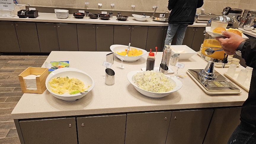 약간의 과일 후르츠와 주스, 샐러드도 구비되어 있습니다. 진짜 과일은 못 본 것 같네요. 통조림 후르츠여서 아이에겐 먹이지 않았습니다.