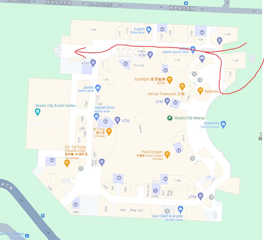스튜디오 시티는 1151/1152 두 지점 사이, 즉 북동쪽에 에스컬레이터 진입로가 있습니다. 그 쪽을 통해서 들어가서 쭉 직진하여 끝까지 갑니다. 거기서 마지막 끝까지가서 문을 열고, 지하로 내려가면 셔틀 버스 탑승장이 있습니다.