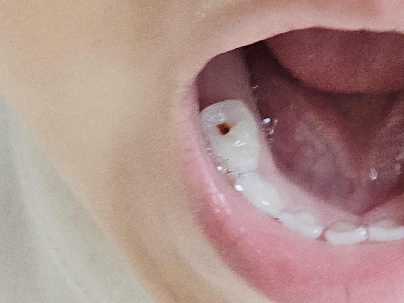 어느날 아이 양치질을 해주려고 보니 어금지 머리부가 색이 다른걸 보았습니다. 충치인가 싶어서 놀랐는데 음식물이 끼었더군요. 그러고보니 어금니 머리 홈이 꽤 깊은게 보입니다.