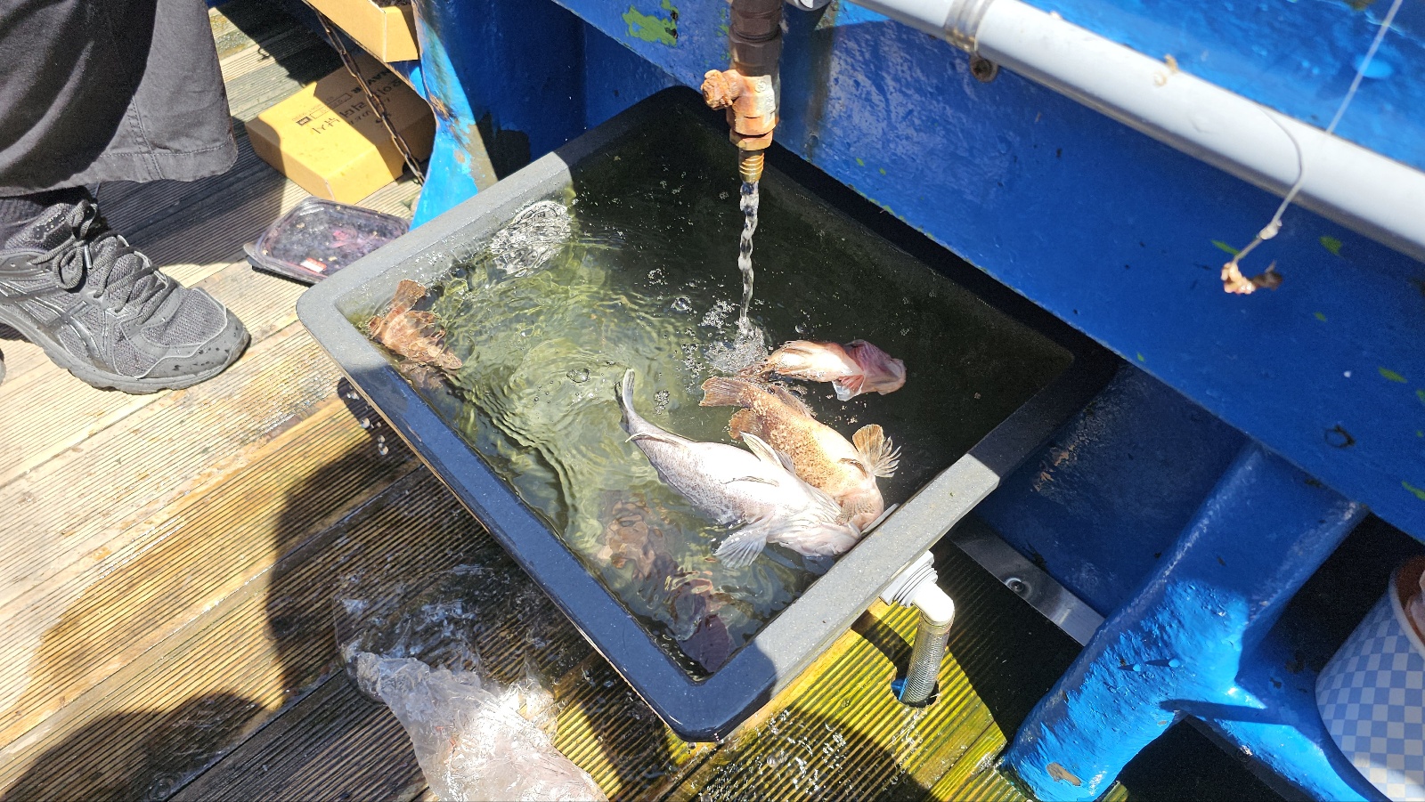 포인트에 도착하면 선장님이 "BEEP"하고 신호음을 주십니다. 그 때 낚시를 시작하죠. 그러다 배를 돌려야하거나 포인트를 이동할 때 다시 BEEP 하고 신호음을 주면 낚시대를 올립니다. 처음엔 작은 볼락만 잡혀서 언제쯤 우럭을 잡아보나싶었습니다. 첫 개시한 물고기는 사진을 찍었는데, 너무 앙증맞아서 사진만 찍고 다시 풀어줬답니다.