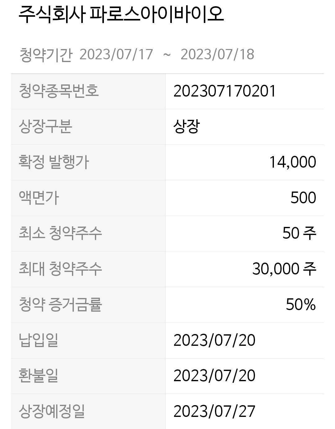 파로스 아이바이오의 공모청약일은 7/17~18 이틀 간 진행됩니다.