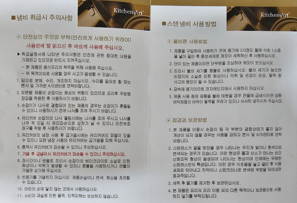 설명서에는 식초 넣은 물을 끓인 뒤 설거지하는 것만 적혀있습니다. 저는 그 전에 식용유로 연마제 제거하는 부분을 추가하였습니다.(장모님&와이프 조언)