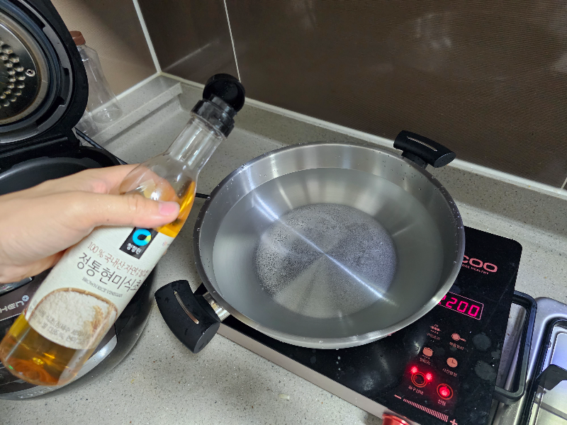4. 냄비에 2/3 정도 물을 붓고 식초를 1~2스푼 정도 양을 추가한다. 팔팔 끓인다.