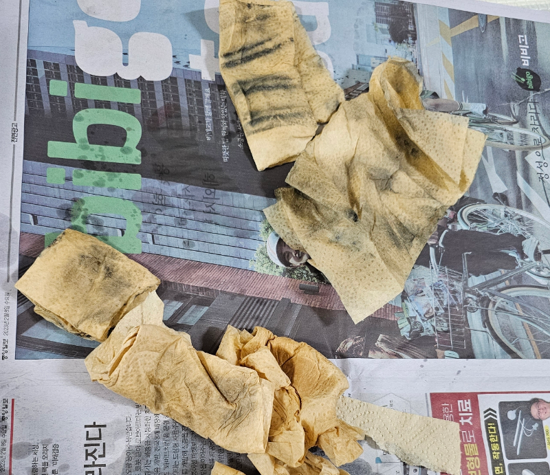 우상단이 처음 닦았던 키친타올이거 하단부가 두 번째입니다. 연마제가 많이 줄었지요?