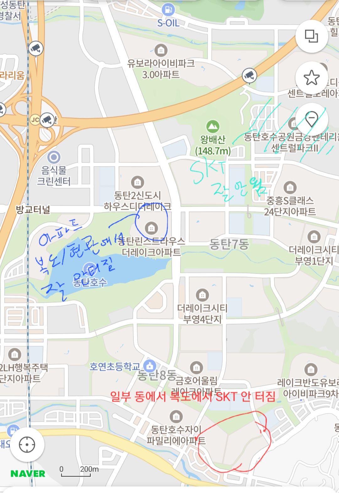- 동탄호수공원금강펜테리움센트럴파크2차 아파트에선 실외로 나와도 SKT가 안 잡히는 경우가 있습니다.
