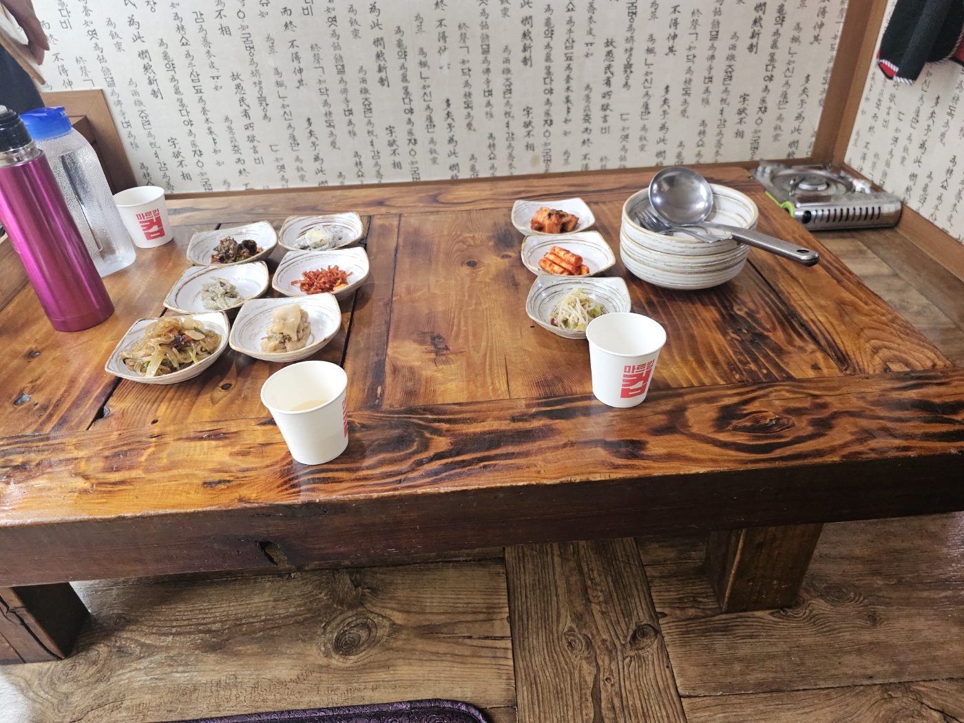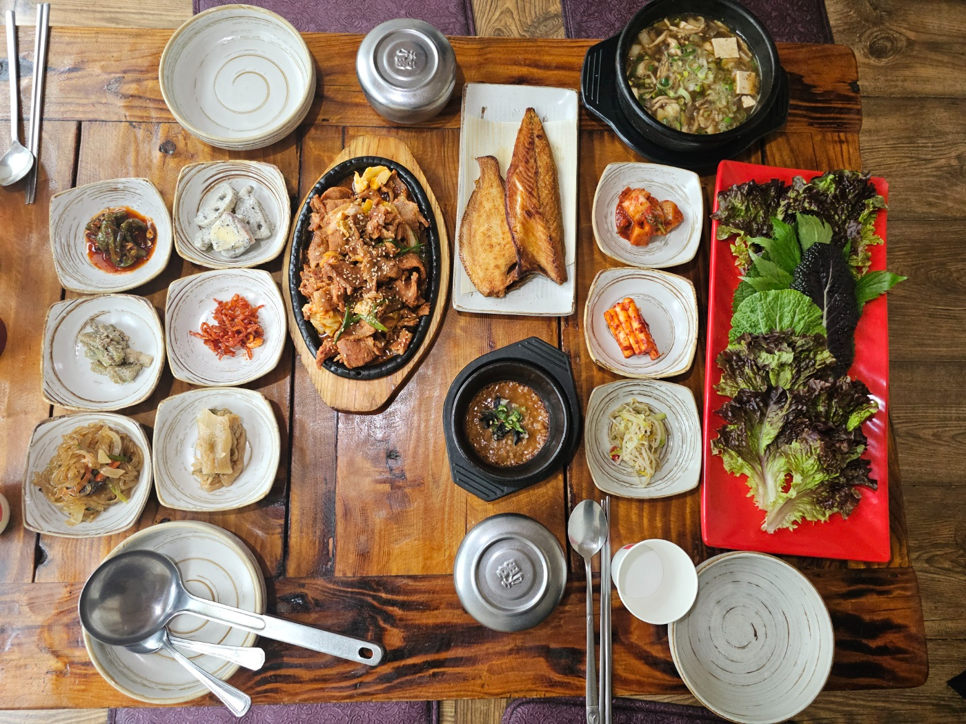 전체적으로 한상차림 구성이 매우 알차고 정갈한 편이라 생각됩니다. 자리가 많진 않아서 가족끼리 한 번씩 와서 한식으로 배를 채우기에 손색이 없어요. 쌈채소도 여러가지 제공되고, 생선이 잘 구워져 나와서 맛있게 먹었습니다. 제육은 맛이 너무 강하거나 하지않아 적당했으며, 우렁쌈장에 밥 비벼먹으면 한 공기 뚝딱입니다. 중간중간엔 된장찌개도 먹어줘야죠. 이 날 아들의 밑반찬 최고 픽은 잡채였답니다. 안 볼 때 살짝 먹어보니 맛있더군요.