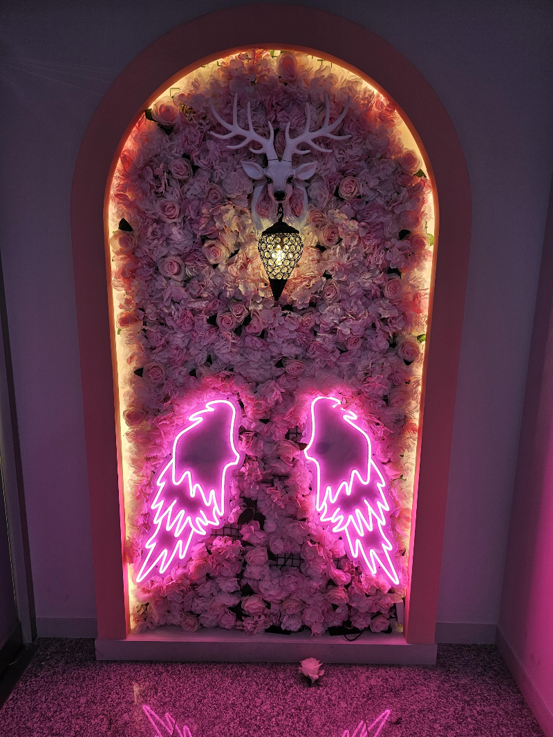 엘리베이터에서 내리시면 왼편에 신발장, 오른편엔 천사 날개가 있는 포토존이 보입니다.