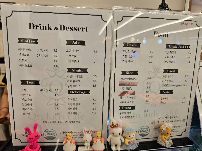 여러 에이드와 커피가 있었으며 메뉴는 파스타/떡볶이/돈가스가 메인입니다. 부모들의 취향을 저격하였군요.