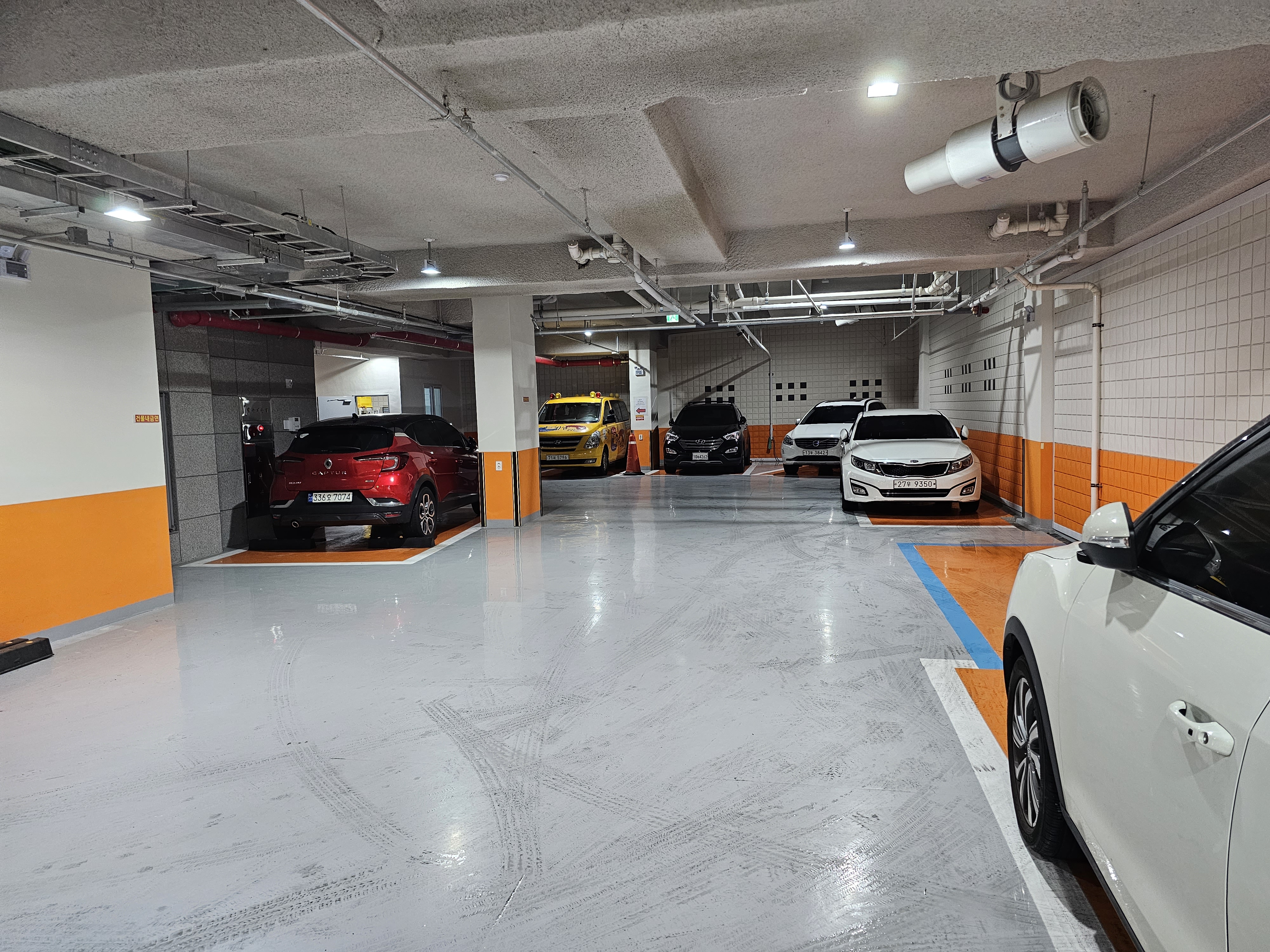 주차는 큰 길 뒷편 화남초 옆 길로 가시면 지하주차장 입구로 들어가실 수 있습니다. 지하 1/2층으로 되어있지만 크기가 협소하여 실제 댈 수 있는 차량은 2개 층을 합하여 열 몇 대 정도로 보입니다.