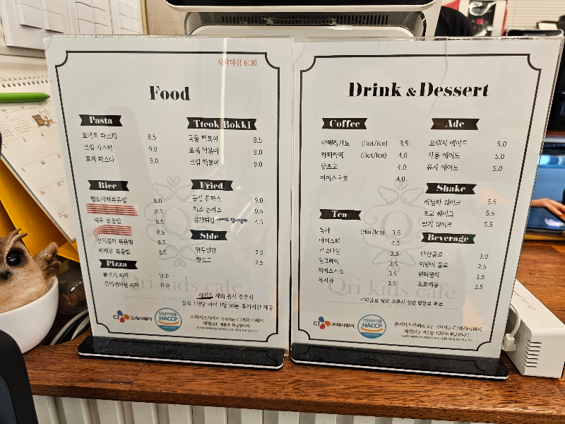 여러 에이드와 커피가 있었으며 메뉴는 파스타/떡볶이/돈가스가 메인입니다. 부모들의 취향을 저격하였군요.