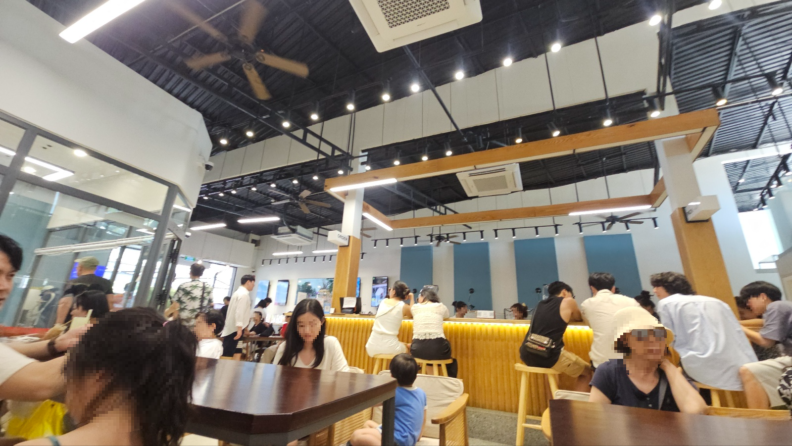 입구에서 대기표를 받은 후, 웨이팅 시간은 약 30~40분. 다행히 바로 옆에 있는 카페에서 실내에서 기다릴 수 있었고, 더운 날씨에도 쾌적하게 시간을 보낼 수 있었습니다. 당시 아이가 낮잠에 들어 안고 있어야 했는데, 실내 대기는 정말 큰 도움이 되었어요. 카페에서는 음료를 마셔도 되고, 마시지 않고 그냥 앉아서 수다를 떨어도 되는 분위기였습니다. 기다리면서 느낀 건, 한국인 방문객이 압도적으로 많았다는 점입니다. 심지어 대기 순서를 알리는 방송도 한국어로 안내가 나옵니다.