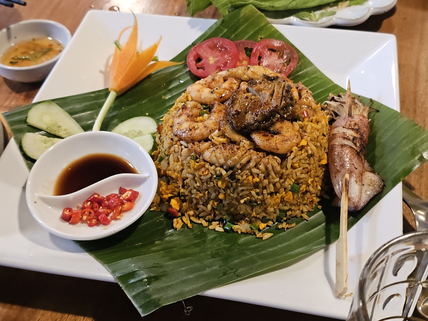 음식 중에는 반쎄오와 해산물 볶음밥이 가장 마지막에 나왔습니다. 시간이 조금 걸리긴 했지만, 그만큼 비주얼과 맛이 모두 만족스러웠습니다. 반쎄오는 직원이 접시를 들고 멀리서 다가오는 순간부터 시선강탈이었습니다. 크기도 크고, 노릇노릇 바삭하게 부친 반죽에 야채와 고기가 푸짐하게 들어가 있었어요. 직원이 직접 가위로 잘라주는데, 그 모습 자체가 하나의 퍼포먼스처럼 느껴질 정도였죠. (동영상도 찍었답니다.) 바삭한 식감과 고소한 향, 그리고 상큼한 소스와 함께 곁들이는 맛이 아주 조화로웠습니다. 볶음밥 역시 훌륭했습니다. 다양한 해산물이 들어가 있었고, 같이 딸려 나온 작은 오징어 구이는 별도로 팔아도 될 만큼 맛있었어요. 볶음밥 자체도 기름지지 않고 간이 잘 배어 있어, 마지막 식사로 완벽하게 마무리되었습니다.
