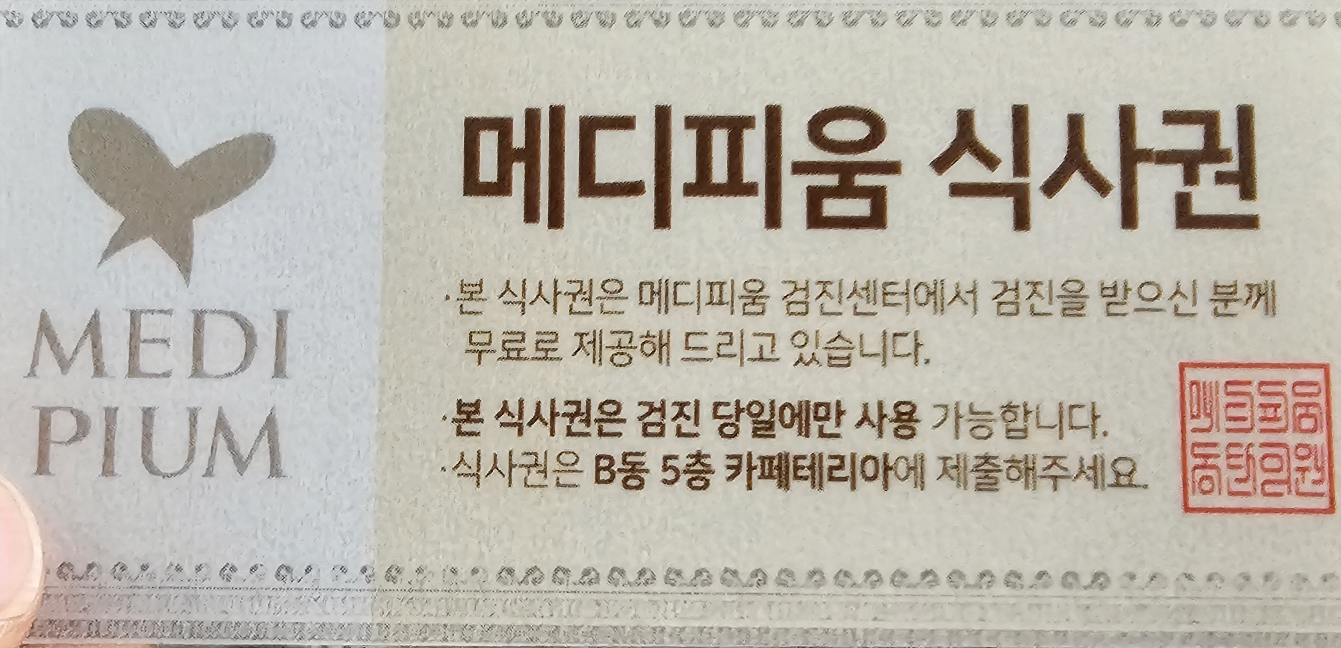 식사는 공짜라 신청했습니다. 그럼 식권을 한 장 주며 B동 5층으로 가시면 된다고 합니다.