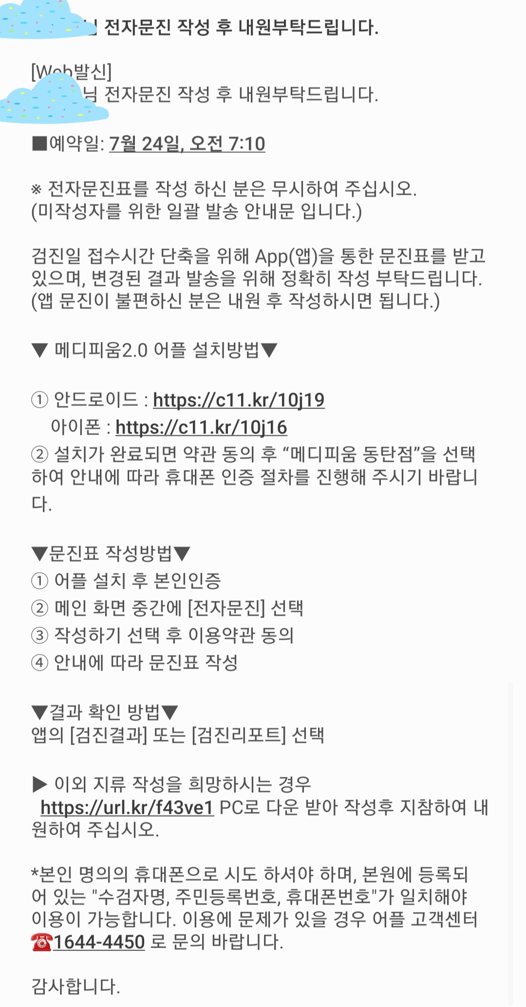 검진 며칠 전 안내문자가 몇 오는데, 그중 전자문진표에 대한 사항도 있습니다. 미리 해두시면 당일 편합니다