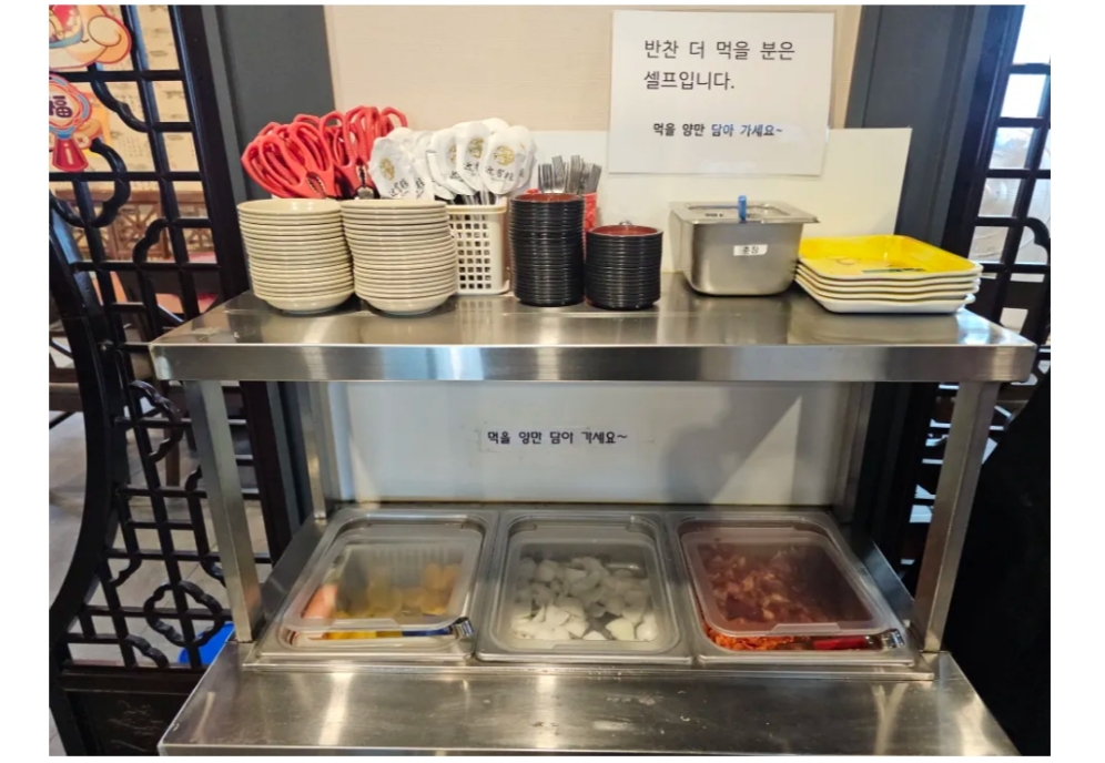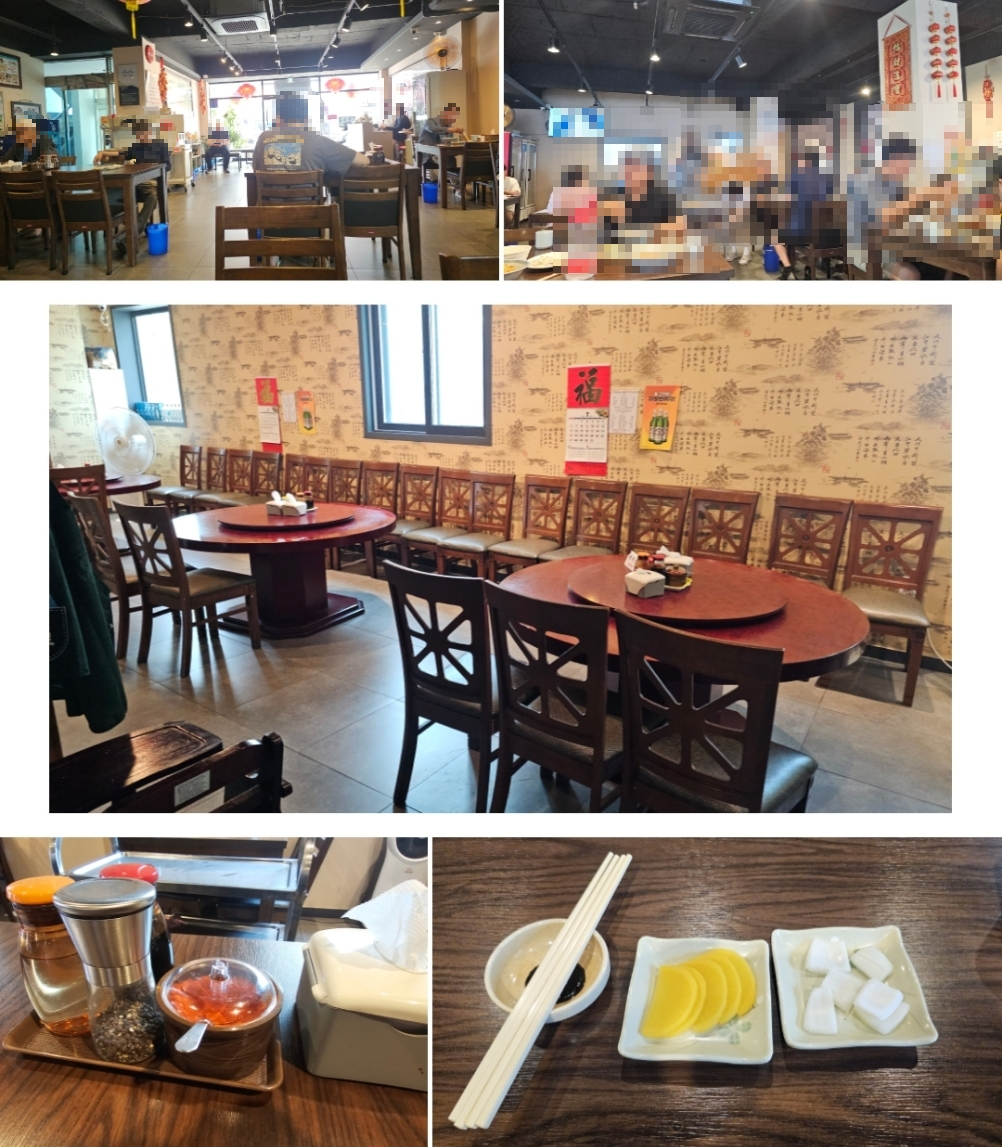 실내엔 좌석이 넓고 많이 뻗어있어서 많은 손님들이 식사중이었음에도 딱히 비좁거나 하지 않았습니다. 문 너머에는 중화요릿집의 트레이드 마크라 할 수 있는 원탁 자리도 있었답니다. 단체 손님을 수용하기에도 좋아 보이네요. 양파, 단무지 등 기본적인 것들이 서빙되며, 부족한 건 셀프바에서 가져올 수 있습니다. 셀프바엔 단무지/양파/김치는 물론 가위, 수저, (아이용) 포크, 앞접시도 있었답니다.