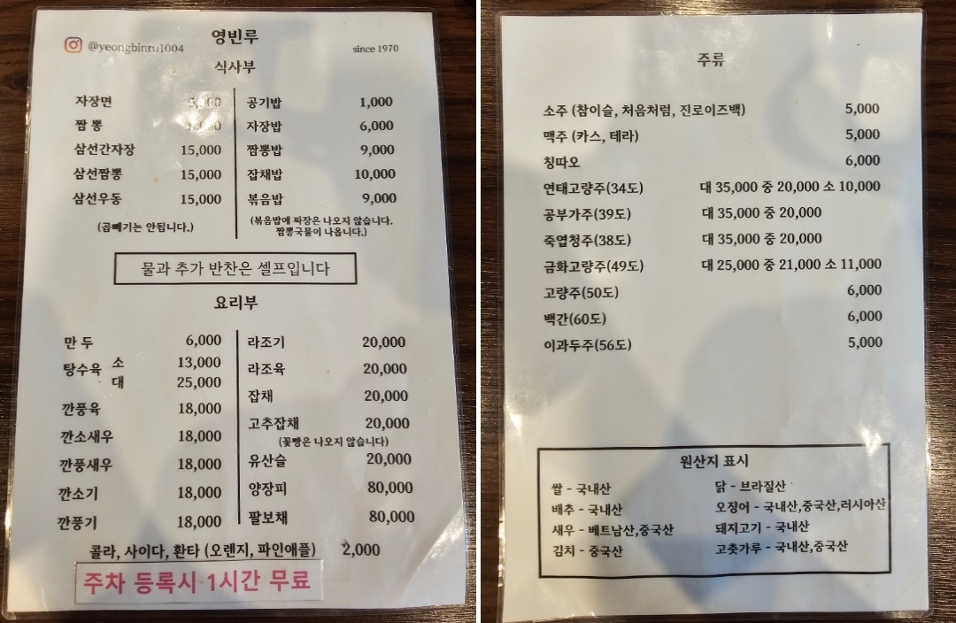저희가 시킨 것은 자장면과 짬뽕밥입니다. 메뉴에 자장면과 짬뽕 가격이 잘 안 보이네요. 자장면은 5천원, 짬뽕은 8천 원입니다. 동탄 등 신도시에선 찾아보기 힘든 가격이죠. 아이와 함께였다면 탕수육도 시켰을 텐데 이번엔 안 와서 2가지 메뉴만 시켰답니다.