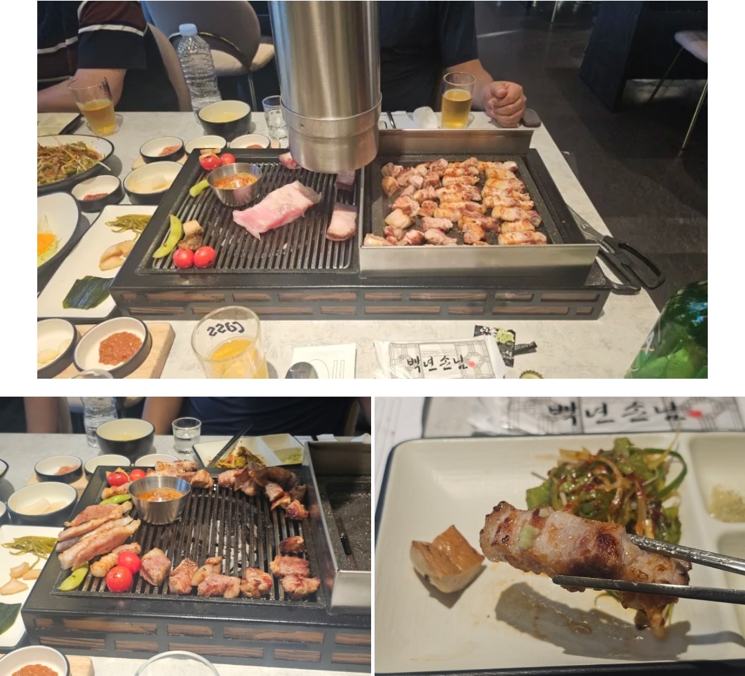 이곳의 신기한 점은 고기를 두 군데서 익힌다는 것입니다. 고기를 직접 구워주시는데, 숯불에 한 번 익힌 후 석쇠로 옮겨서 마저 익히는 형태입니다. 겉바속촉을 위한 이 가게의 노하우일까요. 그래서인지 고기도 아주 맛있습니다. 다들 맛있었는지 고기를 추가해서 배부르게들 먹었답니다.