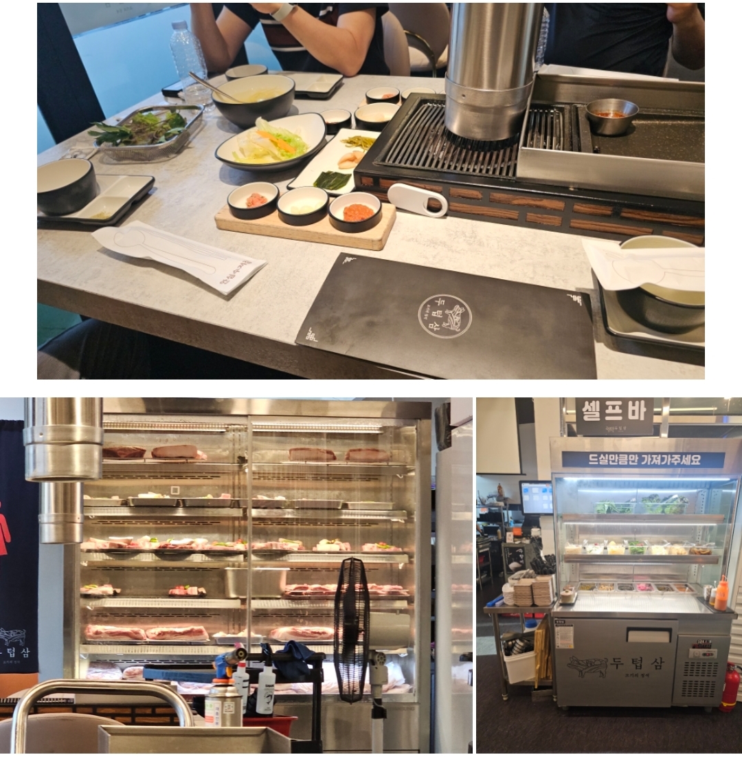 주문 후 기본 찬들이 서빙되었습니다. 수저는 정갈하게 개별포장되어 있네요. 식당 한편엔 고기들이 비치되어 있고, 다른 곳엔 셀프바가 있습니다.