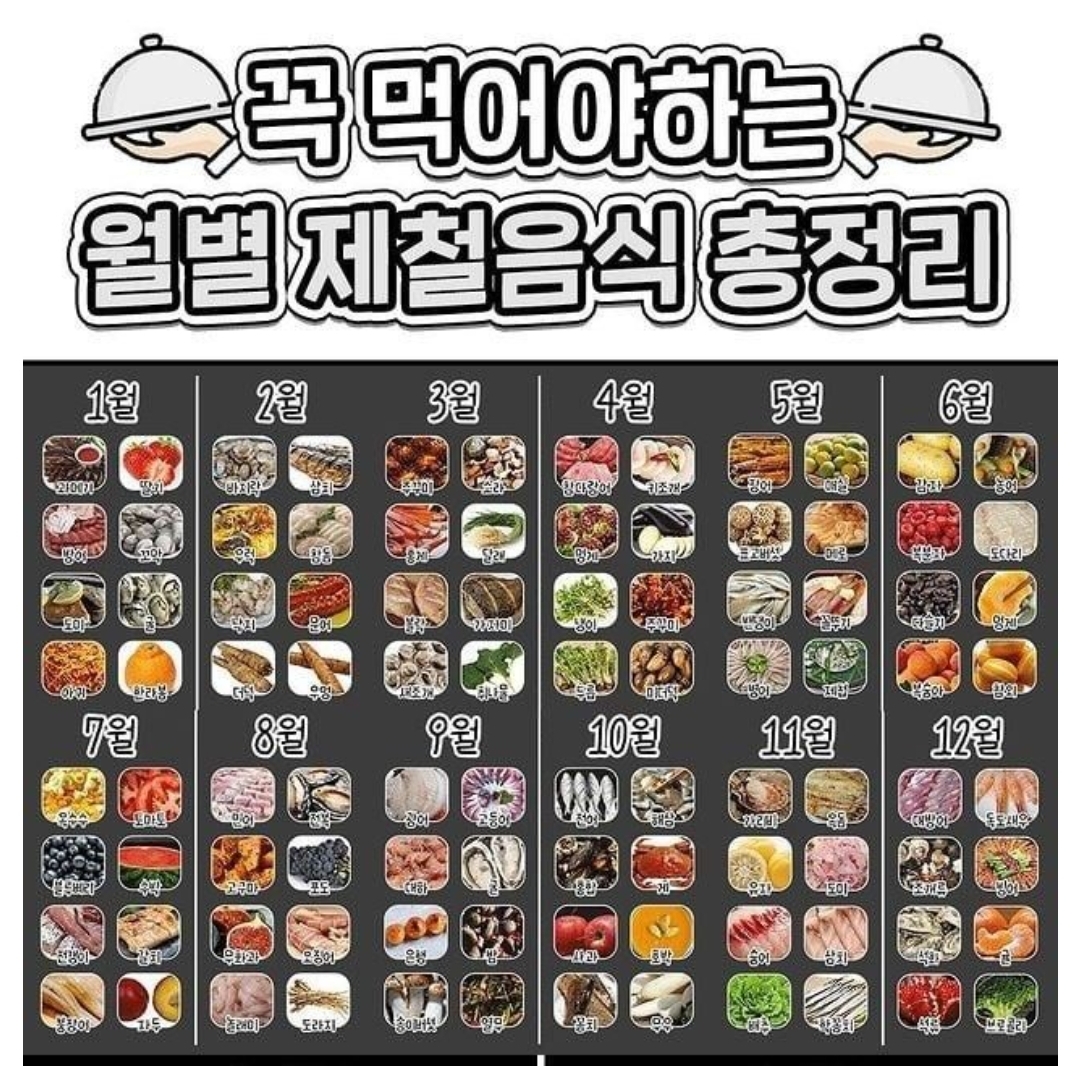 인터넷에서 월별 제철음식 정리한 글을 보았습니다. 두고두고 (내가) 보기에 유용할 것 같아 기록으로 남겨둡니다.
