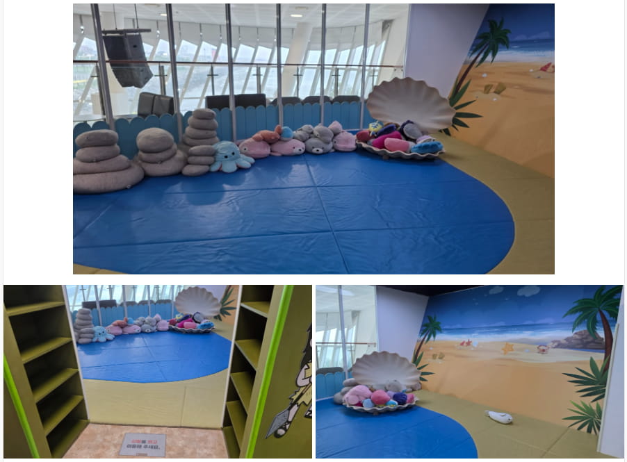 바닷가를 표현한 놀이방도 있어요. 바닥이 푹신해서 아이들과 어른들이 선호합니다. 경험 상 어른들은 뒷편에 의자에 앉아서 늘어져 있느라 선호하는 듯?