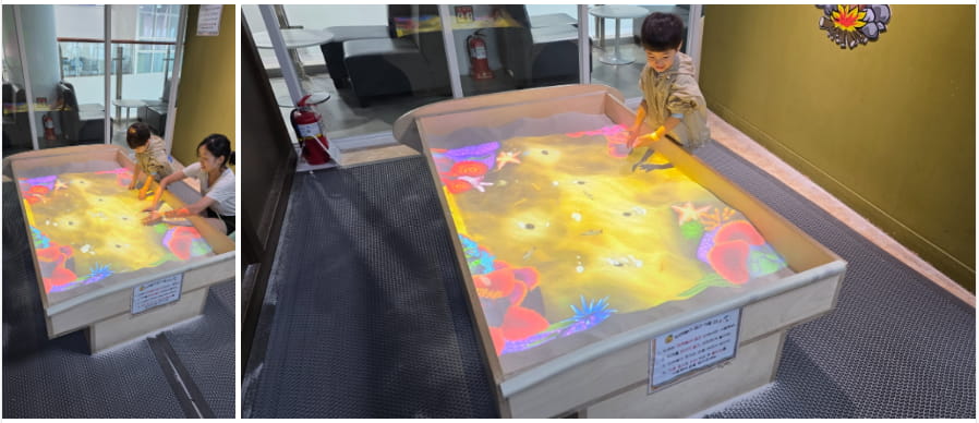 이 체험터의 제일 핫한 체험터는 아무래도 모래놀이 아닐까 싶어요. 아이들에게 인기가 많아서 아들 단독샷 찍기 어려웠던 코너.