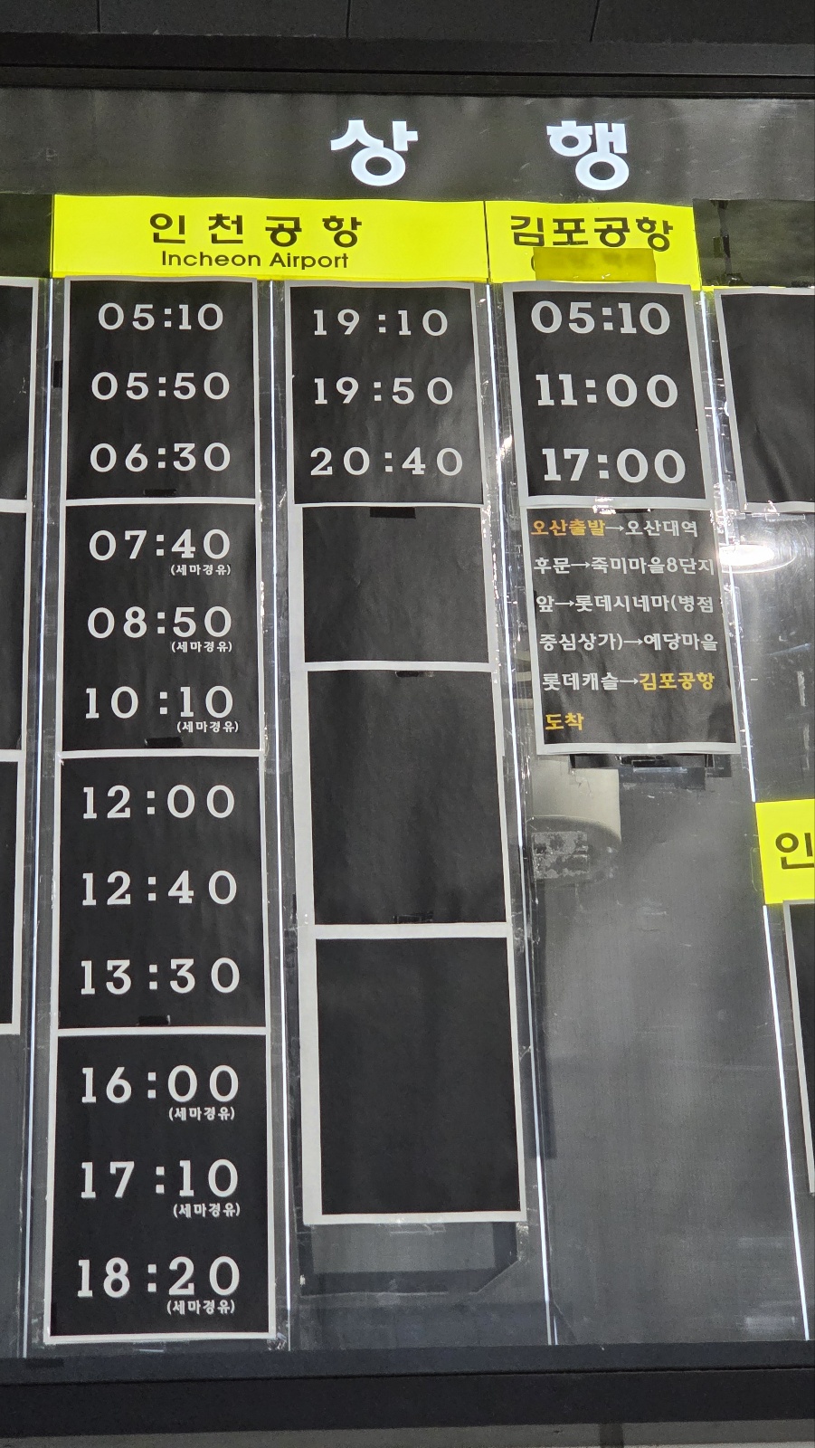 오산역 환승센터는 오산역 지하철/기차역에서 도보로 횡단보도만 하나 건너면 갈 수 있습니다. 매표소 위에 시간표가 있으며, 인천/김포공항행 시간표도 있습니다. 세마역 경유하는 노선은 아래에 (세마경유)라고 적혀있네요.