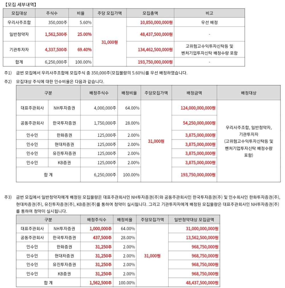 * 해당 물량은 우리사주조합, 일반청약자, 기관투자자 (고위험고수익투자신탁등 및 벤처기업투자신탁 배정수량 포함) 포함으로, 이 중 일반청약자 물량은 상기 수량의 25%임