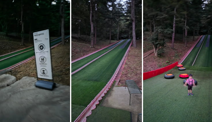 사실상 여기 방문하게 된 이유입니다. 아내가 인스타에서 꽃으로 화사한 슬라이드를 봐서 여기 오게 되었죠. 슬라이드는 마을에서도 꼭대기로 쭉 올라오시면 됩니다. 꽃은 이미 지고 없는 건 예상했지만 해까지 떨어지는 건 미처 예상 못 했네요. 해가 완전히 질 때까지 두세 번 재밌게 타고 내려왔습니다. 튜브 타고 내려오는게 생각보다 재미집니다.