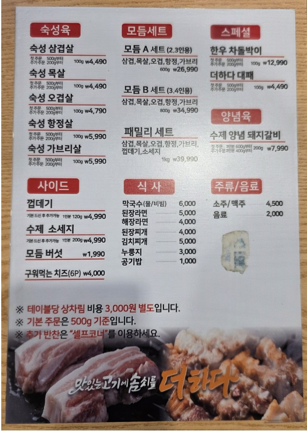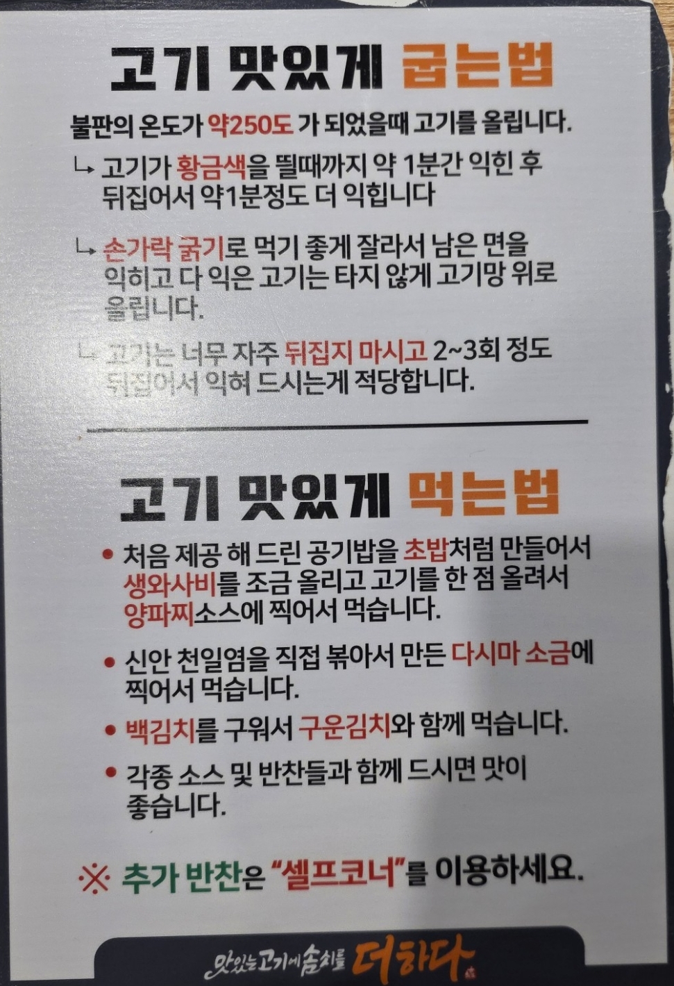 이번 후기에선 저녁으로 먹었던 식당 후기를 적어볼까 합니다. 식당이름이 길어요. "맛있는 고기에 솜씨를 더하다."입니다. 체인점인 듯한데, 줄여서 "더하다."라고 하는 듯해요. 원래 가던 곳이 사라져버려서 이번엔 여기로 가보았습니다.