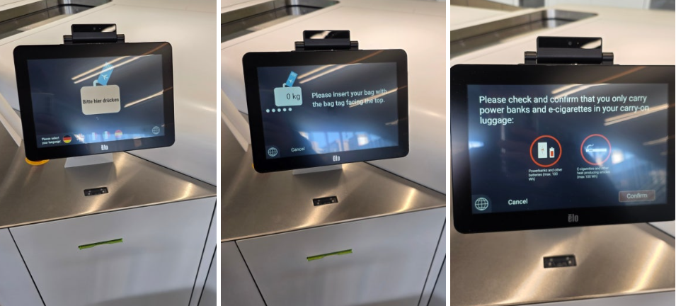 체크인을 마치고 짐을 부치러 가는 길목에 노란색 테두리의 작은 루프트한자 기계들이 보였습니다. 혹시 이것도 필수 과정인가 싶어 보딩패스를 스캔해 보았습니다.