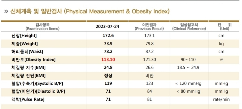 전기자전거가 아닌 일반자전거로 배달을 하면 분명 훨씬 더 힘듭니다. 하지만 살은 확실히 빠지더라구요. 이 걸 어떻게 비교로 보여드릴 수 있을까 하던 차에 건강검진을 저번 달에 하였습니다. 작년과 같은 곳에서 진행한 덕분에 작년 12월 - 올해 7월 말 데이터를 비교할 수 있게 되었습니다.