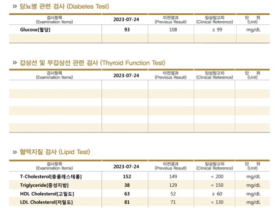 원래 임상참고치 이내였던 총콜레스테롤/저밀도 콜레스테롤은 큰 변화가 없었습니다.