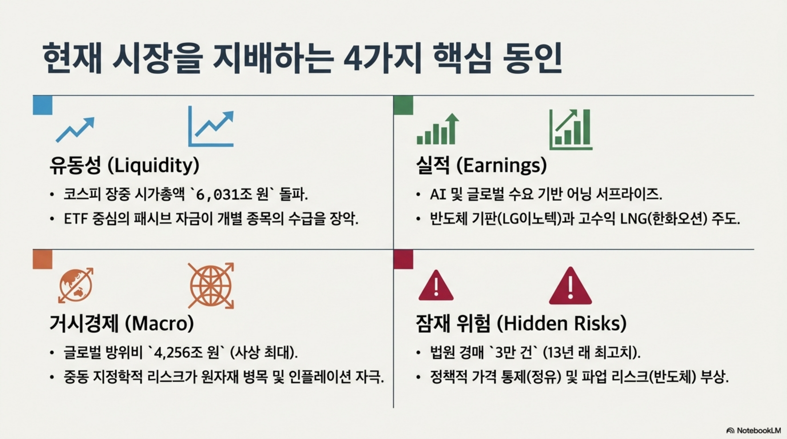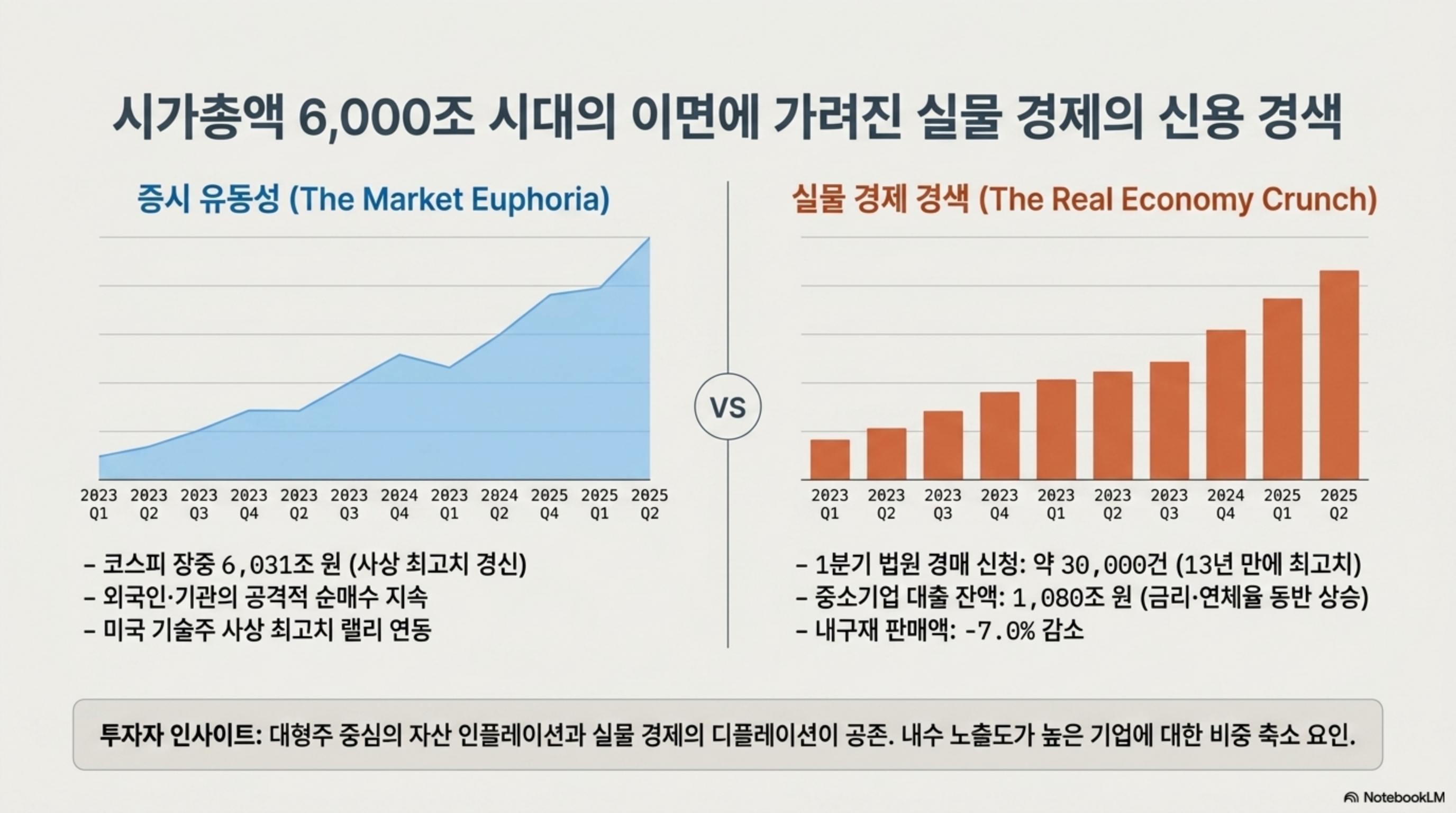 현재 국내 증시는 코스피 시가총액이 6,031조 원을 돌파하며 사상 최고치를 경신하는 자산 인플레이션을 겪고 있으나, 실물 경제는 법원 경매가 13년 만에 최고치(3만 건)를 기록하고 중소기업 대출 연체율이 상승하는 등 심각한 신용 경색이 공존하는 양극화 상태입니다. 특히 패시브 ETF의 시장 지배력이 확대되면서 삼성전자와 SK하이닉스 같은 대형주의 주가가 개별 기업의 펀더멘털보다 ETF 자금 유출입에 더 큰 영향을 받는 수급 구조로 재편되었습니다. 이에 따라 내수 비중이 높은 기업보다는 패시브 유동성의 수혜를 입는 대형주 중심의 포트폴리오 압축이 권고됩니다.