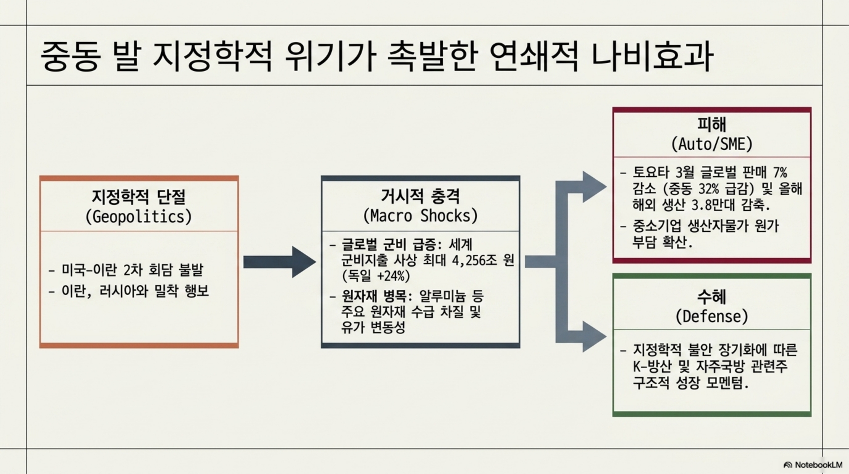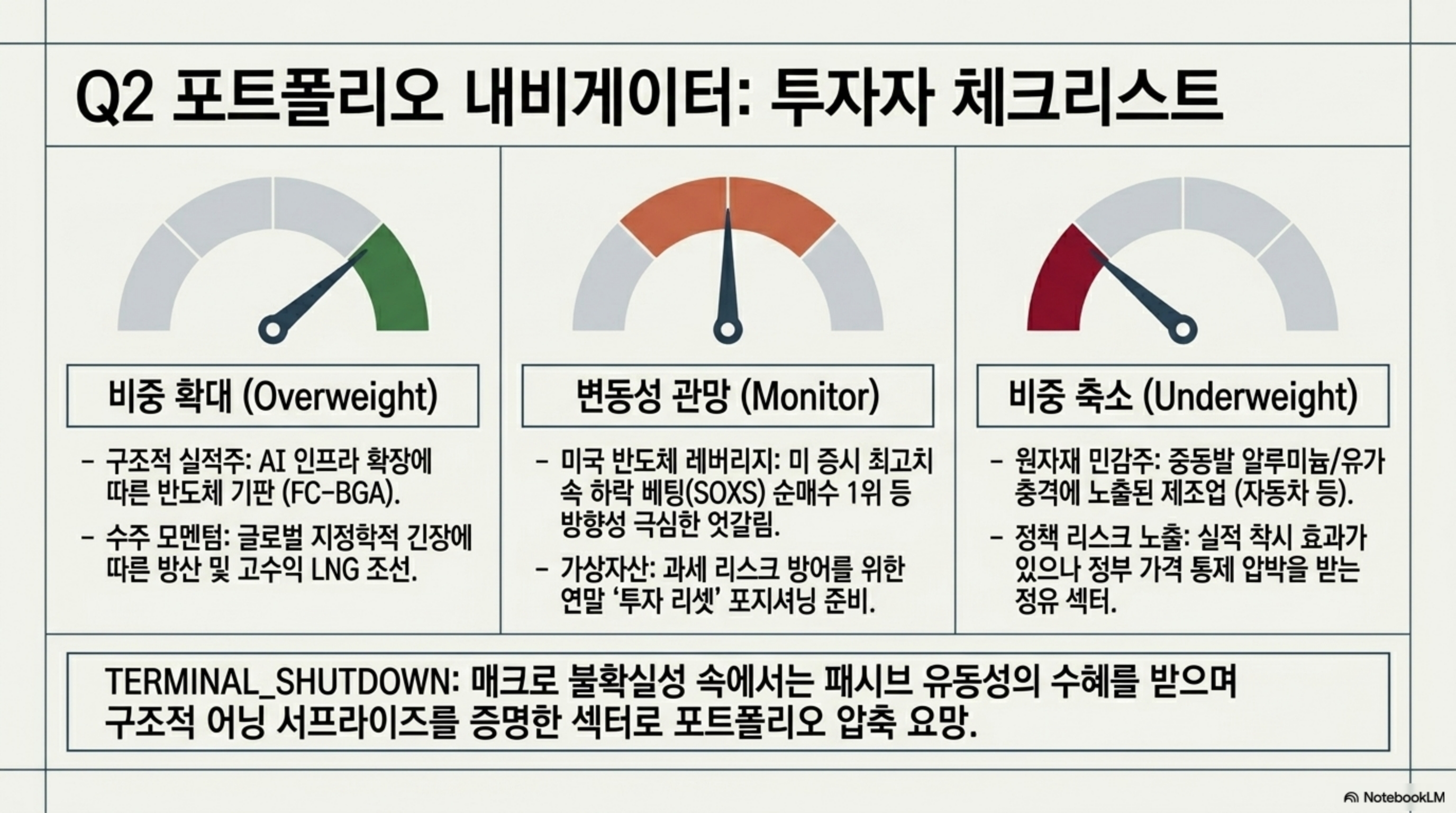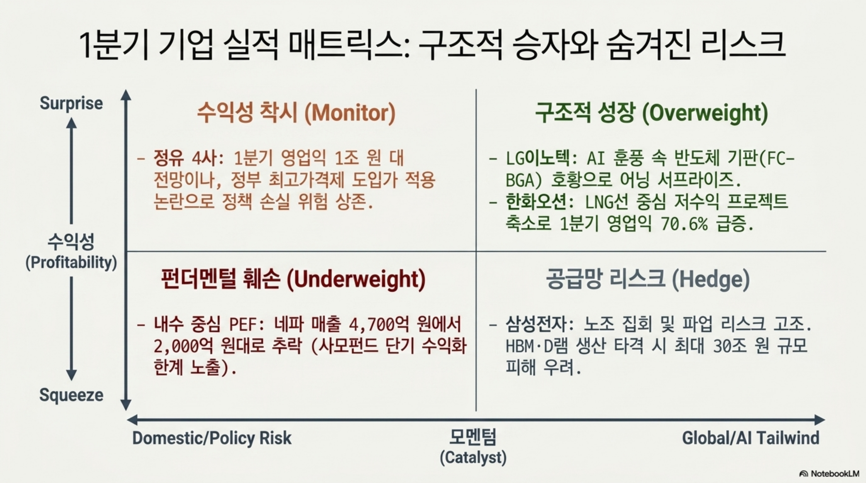 실적 면에서는 AI 훈풍을 탄 반도체 기판(LG이노텍)과 고수익 LNG선 중심의 조선업(한화오션)이 어닝 서프라이즈를 기록하며 구조적 승자로 부상하고 있습니다. 반면, 중동 발 지정학적 위기로 글로벌 방위비가 사상 최대인 4,256조 원에 달하며 K-방산의 성장 모멘텀은 강화되었으나, 원자재 병목 현상으로 인해 자동차 등 제조업의 원가 부담과 판매 감소 리스크는 커진 상황입니다. 또한 삼성전자의 파업 리스크에 따른 생산 차질 우려와 정유 섹터에 대한 정부의 가격 통제 압박 등 정책적 불확실성도 주요 비중 축소 요인으로 꼽힙니다.