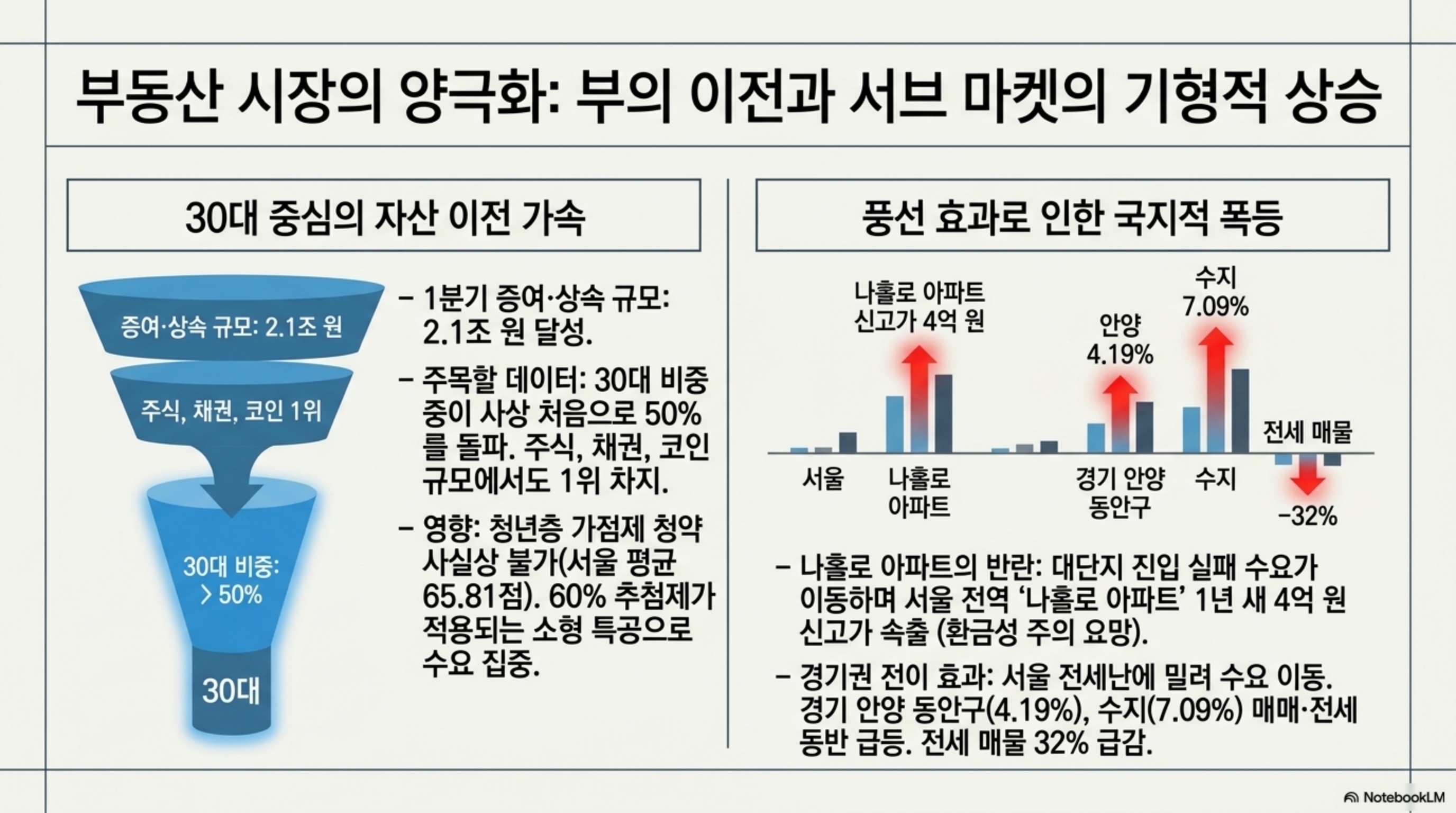 자산 시장 전반에서는 30대 중심의 부의 이전(증여·상속 2.1조 원)이 가속화되며 부동산 시장에서는 서울 '나홀로 아파트'의 신고가 행진과 경기 안양·수지 지역의 전세난에 따른 국지적 폭등이 나타나고 있습니다. 가상자산 투자자의 경우 내년 과세 시행에 대비해, 매수 단가 입증이 어려운 오래된 코인은 연내에 매도 후 재매수하는 '투자 리셋'을 통해 절세 전략을 수립해야 합니다. 결론적으로 AI 인프라와 방산 등 실적 가시성이 확보된 섹터는 비중을 확대하되, 정책 리스크가 있는 정유나 원자재 민감주는 비중을 낮추는 전술이 유효합니다.