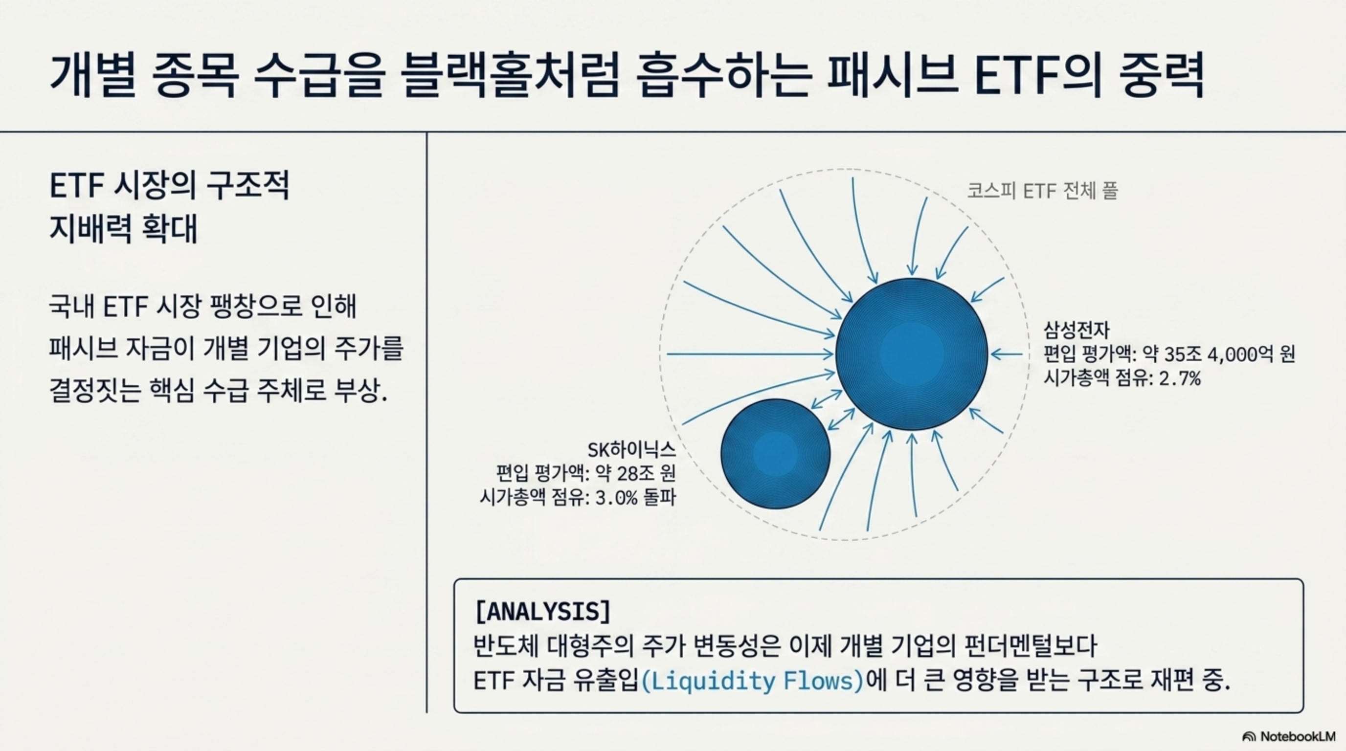 2. 국내 ETF 시장이 빠르게 팽창하면서 개별 종목의 시가총액에서 ETF가 차지하는 비중이 급격히 확대되고 있습니다. 24일 기준 국내 ETF에 편입된 삼성전자 주식 평가액이 약 35조4000억원으로 전체 시가총액의 2.7%를 차지했고, SK하이닉스 ETF 편입 평가액도 28조원으로 시총의 3%를 넘겼습니다. 시장에서는 ETF가 개별 종목 수급을 좌우하는 핵심 주체로 자리 잡고 있다는 평가가 나옵니다.