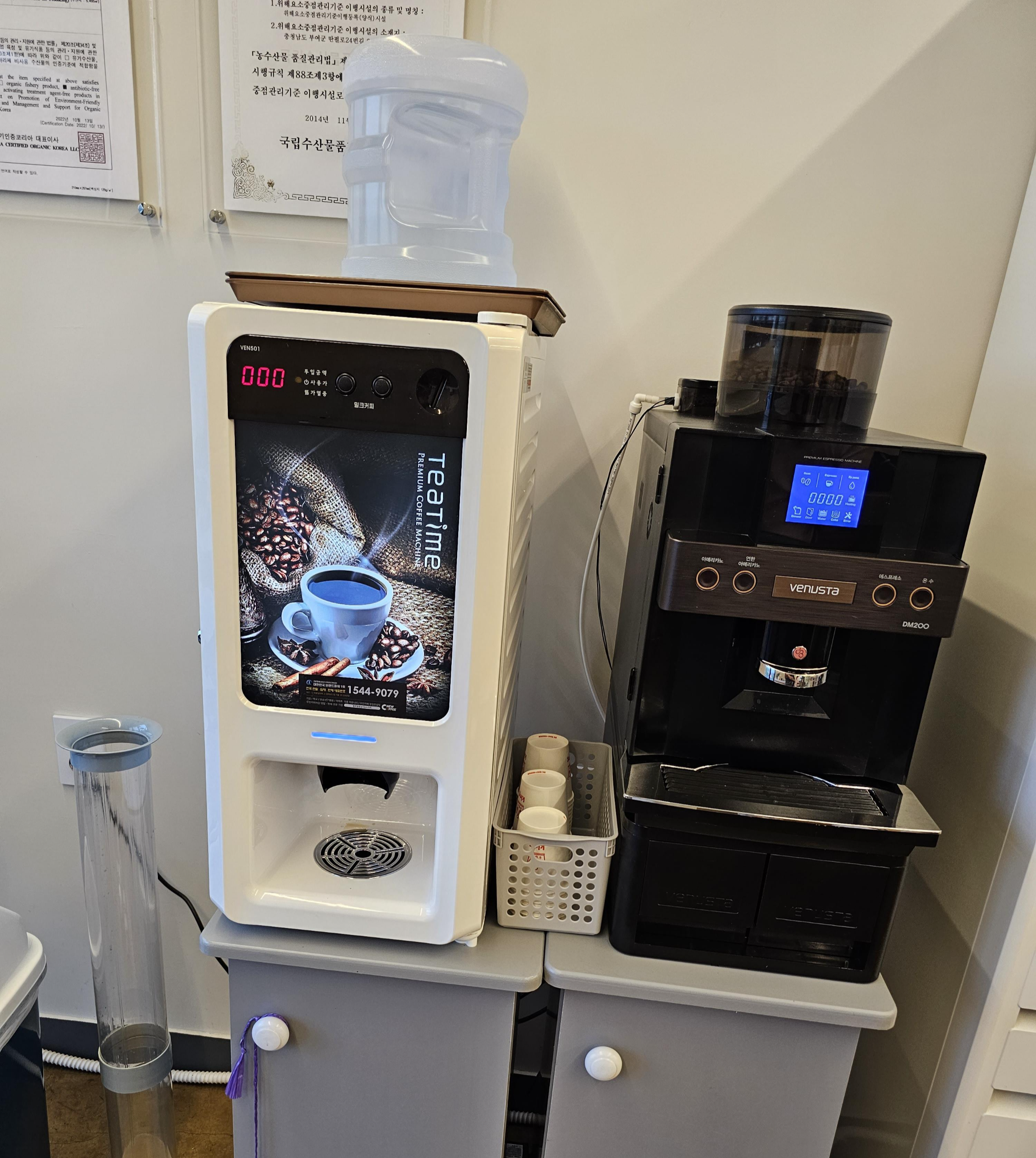 식사를 마친 뒤엔 커피 한 잔 마실 수 있게 커피머신도 구비되어 있습니다!