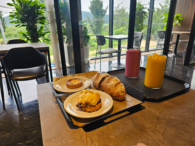 음식과 음료가 나와서 사진 한 장 찍었습니다. 익숙하면서도 싱그러운 배경이 카페와 은근 잘 어우러집니다.