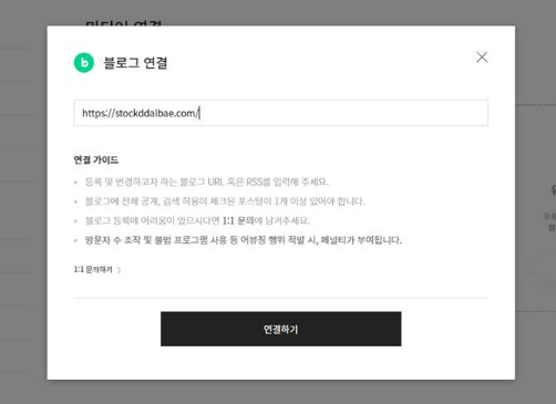 연결에 티스토리 주소를 입력하고 하단에 '연결하기' 버튼을 누릅니다. 하지만 연결이 되지 않습니다. 일시적으로 연결이 지연되고 있습니다. 라는 문구만 뜨고 진행이 안 되네요. 몇 번하다가 포기하고 지내다가 문득 궁금해졌습니다. 되면 되고 안 되면 안 되는 건데 왜 연결 지연 문구만 뜨지? 1:1문의로 되는지 안 되는지만 확인해보고, 티스토리는 지원하지 않는다고 하면 시원하게 포기해야겠다고 생각하였습니다.