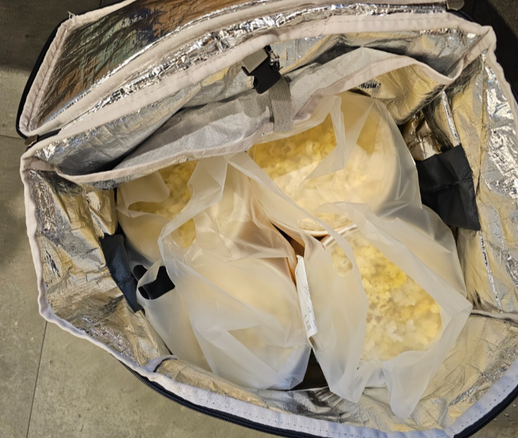이 것이 전부 내가 가져가야할 물량이 맞는지 직원에게 물어보고, 열심히 담았습니다. 다행히 구겨짐 없이 다 잘 들어갔습니다! 팝콘이라서 무겁진 않았지만 보부상 같은 모습에 행인들의 이목을 끌며 CGV를 빠져나왔습니다. 고객님은 현관문 앞까지 나와서 친절하게 잘 받아 주셨습니다. 재밌는 경험이었습니다.