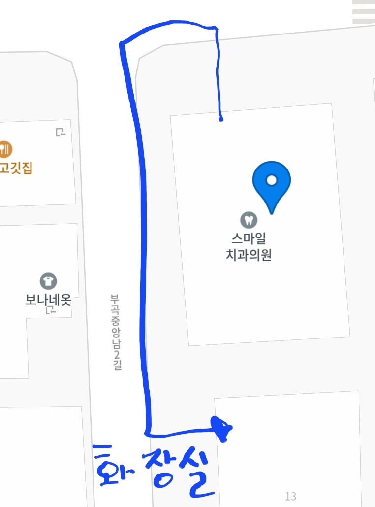 술집 나와서 왼쪽 골목으로 들어가셔서 옆건물 화장실 이용할 수 있습니다.