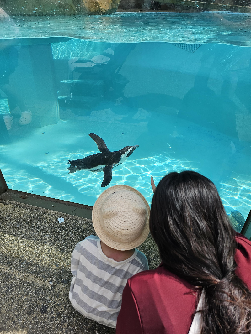 펭귄 아일랜드도 타이거 밸리와 마찬가지로 동물을 가까이서 볼 수 있습니다. 게다가 여기 펭귄들은 품종이 아프리카 펭귄이어서 더운 날씨에도 활발히 활동하는 모습을 볼 수 있었습니다. 그리고 펭귄 아일랜드 우리에서 조금 아래로 내려가면 살짝 안쪽으로 들어간 부분이 있습니다. 여기에 서서 보면 마치 내가 물속에 있는 것 같은 기분을 느낄 수 있답니다.